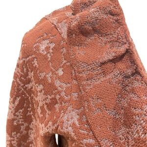 New with tags Chico’s burnout cardigan sweater pattern in rich mahogany. Ruffle collar. Open front. Made in cotton, polyester, other. Euc