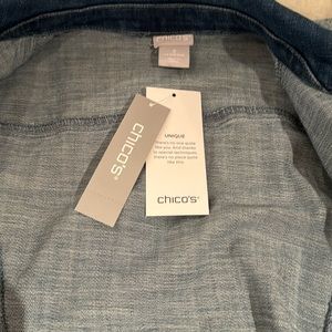 This is a brand new Chicos, classic jacket, tie-dye denim with reverse tie-dye. It is a size 3 brand new with tags. This has never been worn. It has been hanging in my closet for three years. It is time to put it in the posh closet.