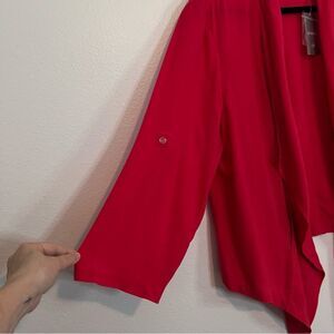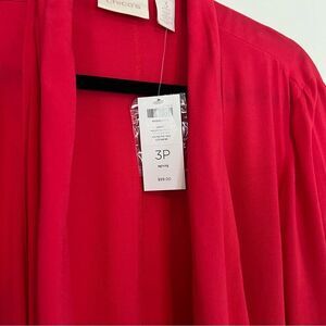 NWT Chico’s Jacket. Cardigan. Red. Hi-Lo. Size 3P (XL 16). Petite. Long Sleeve W/ Roll-tab. Open front. Pockets. Length from shoulder to bottom 32” at the longest point. Shoulder to shoulder across back is 19.5”. 100% Rayon