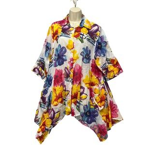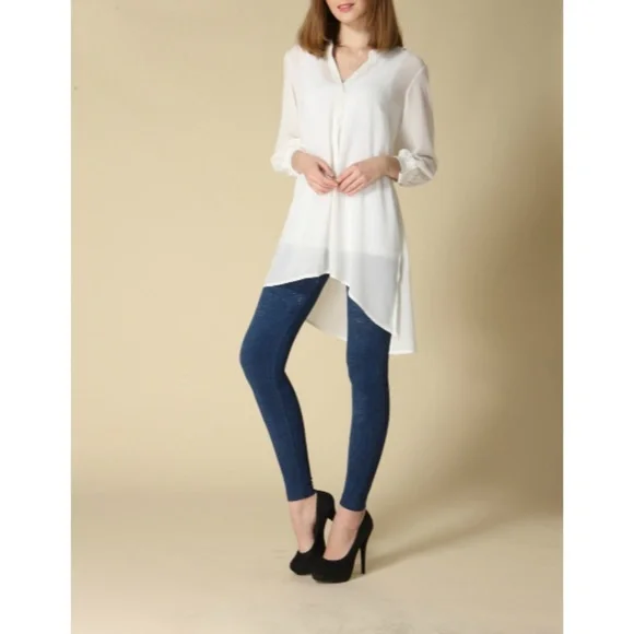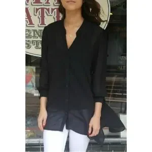 Sheer chiffon, collared, 3/4 sleeve tunic top with a high-low hem. Available in black or white. Meant to be loose fit. Button-up closure on v-neckline. Pit to pit 20", length at shortest (front) 30", length at longest (back) 35", sleeve length 20". Fiber Content: 100% polyester. Camisole not included. New from wholesale manufacturer.