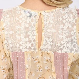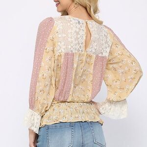 NWT! Chiffon Prints and Crochet Lace Mixed Top Smocked Waist and Back Key Hole