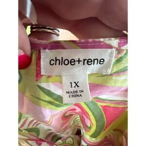 New with tags Chloe + Rene size 1X cotton dress in lime green, white and pinks. Ties at the waist. Measures 24” from armpit to armpit. 20” across the waist and it is 37” long.