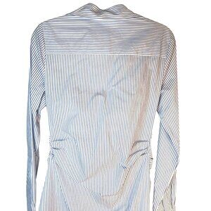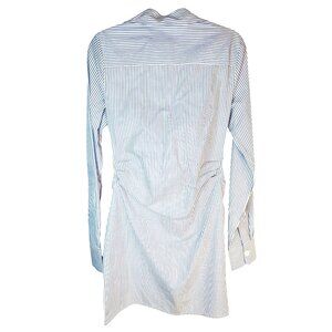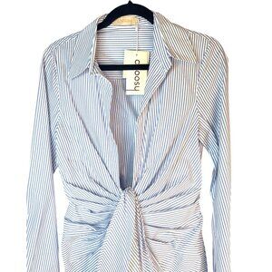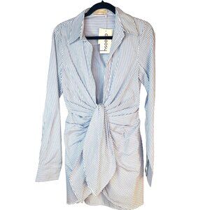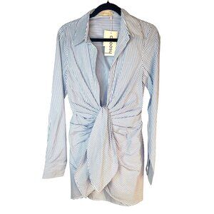 shirt dress, mini dress, blue and white, striped, pinstripe, cotton blend, collared neckline, button front, long sleeve, tie waist, draped front, tailored fit, modern chic, stylish, trendy, elegant, office wear, work attire, day to night, spring summer, versatile, timeless, fashionable, contemporary, shirt dress, twist front, Choosy, striped dress, cotton dress, size 6, blue and white, long sleeve, collared dress, casual wear, semi-formal dress, machine washable