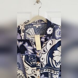 NWT Christian Siriano Linen Blend Short Sleeve Shirt Blue Floral Size Large