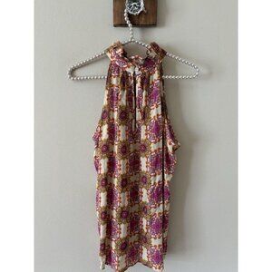 This is a women's NWT pink floral sleeveless blouse with a high ruffle neckline and a single button closure in the back from Christian Siriano, size Small.