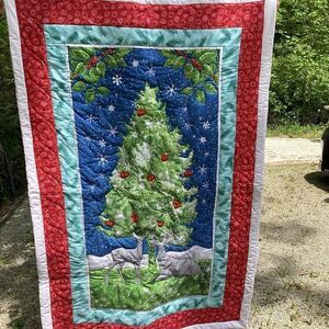 New with tags. Hand crafted from all new 100% cotton fabrics and made in a smoke free home. A beautiful night in the quiet forest as two deer stop to a admire a tree decked out in lights and red ornaments. I’ve accented the scene with a pine needle green and blue border and a larger red and white border followed by a white contrasting border. Can’t you feel yourself peeking over their shoulders! It reverses to a solid red marble coordinating fabric. Comes with care instructions. Measurements: 36” x 57 1/2”.