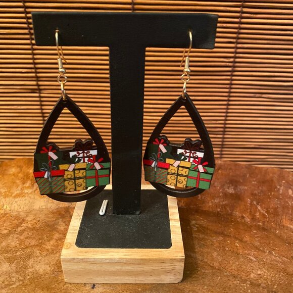 NWT Christmas Present Pile Wooden Cut out Pierced Dangle Earrings