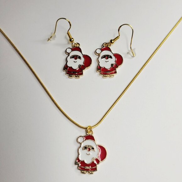 Bright and shiny red, gold and white color Santa Claus charm hypoallergenic earrings and necklace set with a 21 inch (approx) gold color snake chain for Christmas! Hypoallergenic. Same day shipping. Two sets available. Retail packaged. Made in Texas! Bundle and save!
