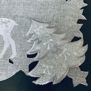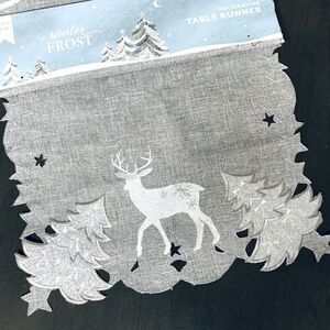 NWT beautiful fabric Christmas winter farmhouse reindeer holiday embroidered cutout dining, living room or buffet table runner. Neutral gray color with silver metallic threading. 14”x68” Pictures do not do justice!