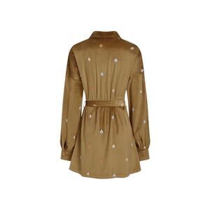 New with tags! Khaki colored faux corduroy dress with long sleeves and floral embroidered print. This shirt dress features a collar, V neck and belt at waist for flattering and comfortable fit! 100% polyester. Women’s size medium.
