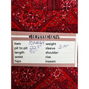 In a world of patterns, this dress tells a tale of vibrant reds and playful prints. The intricate bandana design blends seamlessly with whimsical polka dots, creating an ensemble that sings of joyful days and spirited nights. A piece from Cider, it effortlessly encapsulates a bold yet charming narrative. NWT