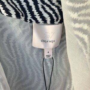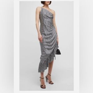 Cinq a Sept Silk Christel Ruched One Shoulder White Black Midi Dress Size 4 New with tags With a one-shoulder design featuring a ruffled asymmetrical hem, side rouching and playful black and white pattern, you'll make a statement at any event. Zipper Closure