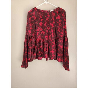 Dramatic bell sleeves pair with the flounce hem of this vine printed silk blouse with a delicate back keyhole. - Crew neck - Long bell sleeves - Back button closure with keyhole detail - Cypress vine print - Flounce hem - 100% Silk