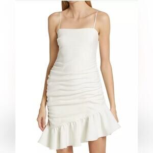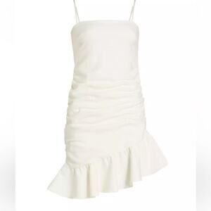 The Lilith dress from Cinq à Sept features a fitted, ruched bodice with a straight neck and spaghetti straps. An asymmetric ruffled hem finishes this mini-length style.