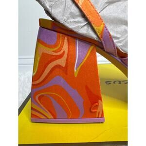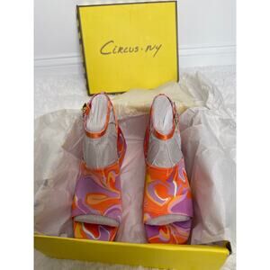 Stand out in bold retro style with these Circus NY by Sam Edelman Miranda Jewel heels in Orange Multi. Featuring a psychedelic swirl print in orange, pink, and purple, these heels bring instant statement flair to any look. Designed with a chunky block heel, open toe, and platform sole for added comfort and stability. Adjustable ankle strap ensures a secure fit. Perfect for nights out, parties, or adding a pop of color to your wardrobe. Women’s size 8.5M, new in box.