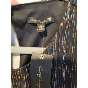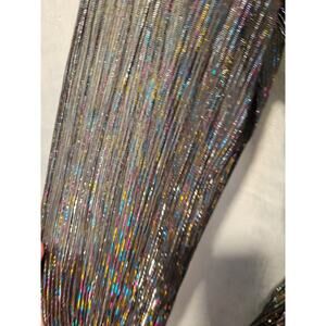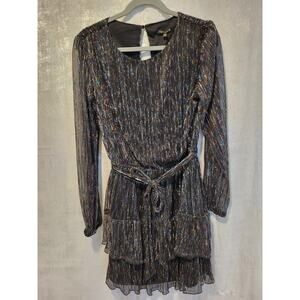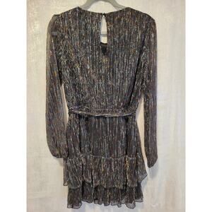 NWT City Triangles L Multicolor Metallic Stripe Ruffle Long Sleeve Dress Shimmer Fairy Festive Party Fairycore Rainbow Whimsy Blue Pink Turquoise Gold Black Chiffon Red Green Yellow Layered Elastic Waist Fit & Flare Tiered Glitter Orange SemiSheer Keyhole Sleeves Belt 303