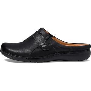 The Clarks Unisex Un Loop Ease Sneaker in Black Leather is a versatile, casual shoe designed for all-day comfort. Made with soft premium leather, it features Clarks' Unstructured® technology for lightweight, breathable wear. The slip-on design with a side button detail offers easy on-and-off convenience, while the cushioned insole and flexible outsole provide superior support. Size: 10 US Women.