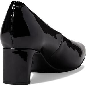 Clarks Women’s Kyndall Iris pump in black patent synthetic, size 10W. Sleek classic heel with glossy finish and cushioned comfort—ideal for work, dressy outfits, and special occasions.