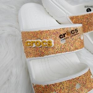 Classic Crocs Unisex Size 7 Women's or Men's Size 5, Orange Sorbet Glitter Sandals. The look and feel of our comfortable Classic Clog and Crocs Slide, now in sandal form. Two upper straps covered in glitter offer even more style, and seven holes on each shoe allow you to personalize with Jibbitz charms. We'll even get you started by including a Crocs logo charm. Original Croslite™ foam cushion will keep you supported from the beach to backyard gatherings and beyond.