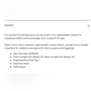 Open front. Short sleeves. Lightweight woven fabric. Longer tunic length is perfect for added coverage with skinny jeans and leggings.
