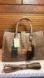 EXTERIOR: embossed crock in new condition no scrapes, scratches, rubs or loss of color. Season spanning shades of tan with black grain lines. Turnlock close. Rolled handles with 5” drop.