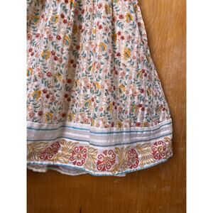 New with tags attached, retail $198. Lightweight cotton voile with woven stripe and floral block print. Open tie back, elastic sleeves and waist, full skirt lining.