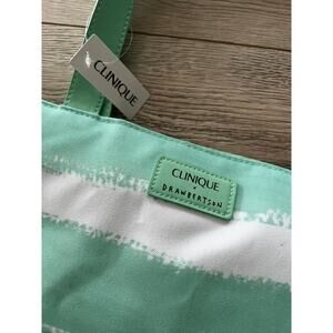 This NWT Clinique x Drawbertson tote bag is the perfect accessory for carrying your essentials in style! The vibrant green and white striped design is eye-catching and fun.