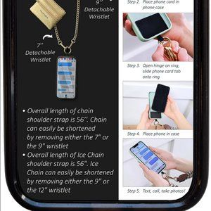 This attractive, extremely comfortable, cross body shoulder chain offers more than meets the eye! The multifunctional design allows your phone to hang at your side hands free, while the included innovative hanging phone card, convenient zippered change pouch and detachable wristlet combine to create a product that has undeniable global appeal.