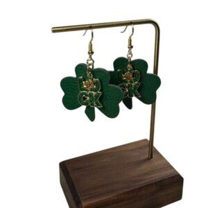NWT Clover-Shaped Green Faux Leather Earrings With Gold "Luck" & Shamrock Charm