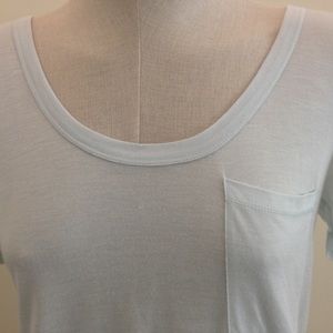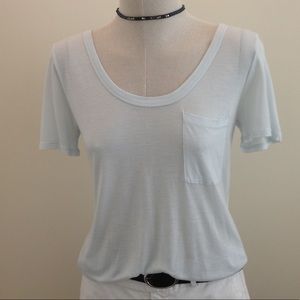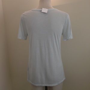 Club Monaco's Sunny Tee is the perfect casual T shirt. Pair this ultra soft light weight tee with shorts in the summer or layer it under your favorite leather jacket as you transition in to the fall. This is a light blue short sleeve tee, and may require a camisole underneath as the material is a bit sheer.