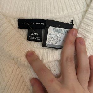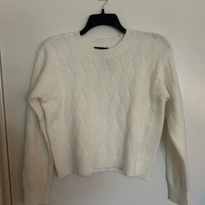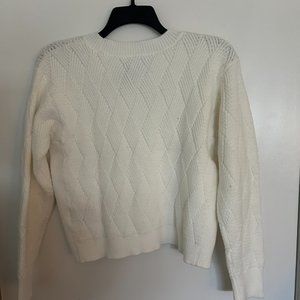 New with Tags! Long-sleeve, cropped sweater in white. A small imperfection in the bottom left side of the front, where the knit is slightly stretched. Not extremely noticeable and should resolve itself once washed.