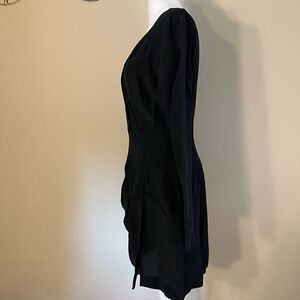 A sophisticated Club Monaco dress in black silk, accented with fluid gathering at the side for a subtle touch of asymmetry. Wrap silhouette with draping and pleating. Crossover V neck and long sleeves. Hidden zip at side.