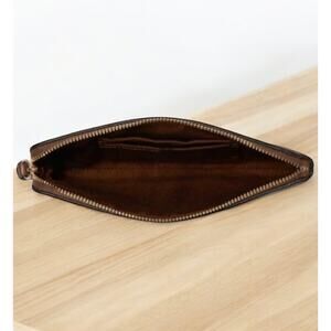 Exterior – Coated canvas, gold hardware, attached wrist strap and corner zip closure.