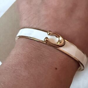 It is laid out simple yet timelessly elegant Gold White bangle Bracelet with Coach Logo in the middle.