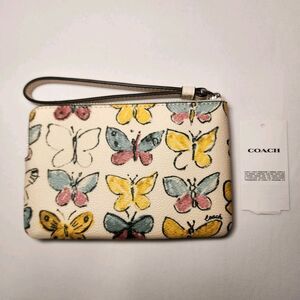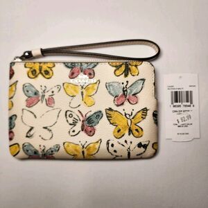 NWT Coach CAQ55 Corner Zip Wristlet Chalk Yellow Butterfly Printed Canvas V3
