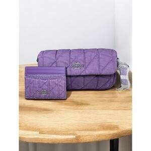 This New With Tags Coach CBI88 Hailey Quilted Flag Bag and CBR13 Quilted Denim Slim ID Card Case from 2025 is the cutest set! Featuring 100% cotton sourced from regenerative farms in the Iris/Silver colorway, this set is both super stylish and functional with two removable straps for shoulder or crossbody wear. Coach is always on point and if you love Coach design and quality, you need this set in your collection!