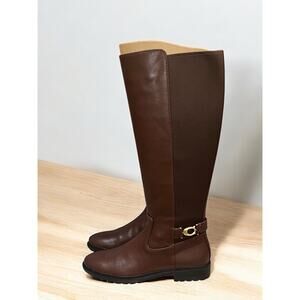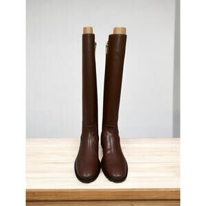 These New With Tags Coach CO490 Faith Leather Boots in Size 9B are the perfect Fall/Winter boots! Featuring leather and nylon/elastic in the Walnut/Brass colorway, these knee-high zipper boots will elevate your wardrobe with their equestrian inspired details and clean silhouette. If you love Coach style and quality, you need these stylish boots in your collection!