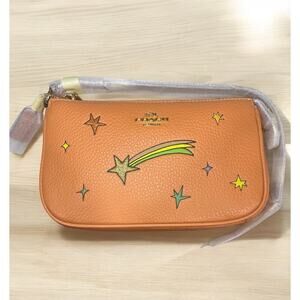 This New With Tags Coach CU470 X Observed by Us Leather Star Print Nolita 19 Bag from 2024 is such a cute little bag! Featuring refined pebble leather in the Faded Orange/Multi colorway with gold hardware, this bag is perfect when you want to travel light. If you love the style and quality of Coach, you need this adorable print in your collection!