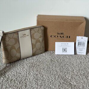 NWT Coach Corner Zip Wristlet In Signature Canvas With Stripe - Gold/Sand/Chalk
