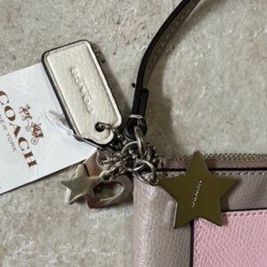 From retail store. Grey and baby pink color block cross grain leather. pink fabric lined. Never used and brand new with tag. Shiny silver hardware. Charms include one large enameled sparkly star, one small silver star, one small heart, and one metal coach tag. Also has a leather coach hangtag. 6.75 x 4 x 0.5. Will send with a coach dust bag