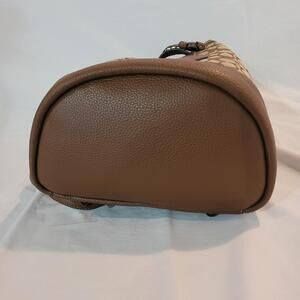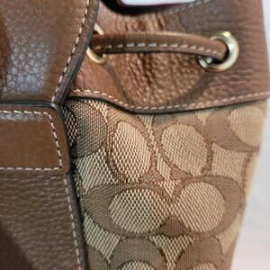 In Tan signature jacquard canvas with refined pebble leather accents, stripe and Coach patch.