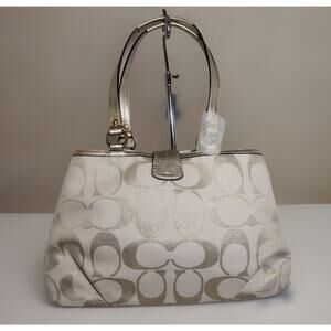 This stunning Coach Soho Signature Metallic Carryall (style F20583) is brand new with tags, new without being carried. It features a shimmering gold-metallic finish overlaying the iconic Coach “C” pattern, paired with leather trim and polished brass hardware for a luxe yet functional look.