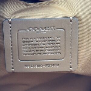 The NWT Coach F31400 Leather Elle Hobo in Chalk/Old Brass Carriage Logo is a stylish medium-sized handbag featuring the iconic Coach logo as a pattern. Made from leather with brass hardware accents, this hobo/shoulder bag has a zipper closure and adjustable strap for practicality. With a height of 10.75 inches, a depth of 4 inches, and a length of 13 inches, this women's bag is versatile and perfect for everyday use. The combination of chalk/oold brass exterior color and leather lining makes it a chic and timeless accessory for any outfit.