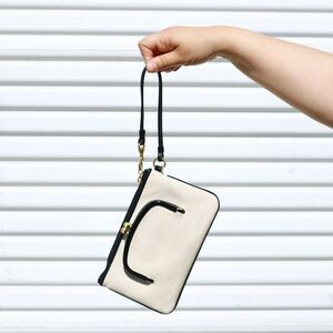 Made of canvas. LIMITED EDITION!! Collector's must! - Approx. 7 1/2" x 4 3/4". Approx. 12" strap with 6" drop. Strap comes with dog leash clip to form a wristlet or attach to a larger bag. Zip top closure. Outside back kisslock pocket. Inside slip pocket. Fabric lining. bonnie_w_42582nat00