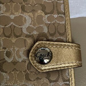 Chic Coach clutch with iconic pattern. Metallic gold finish and secure snap closure. Dust bag too!!!!