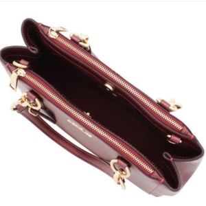 Never been used. Metallic cherry with light Gold. Cross grain leather. Inside snap and multifunction pockets. Snap closure and fabric lining with side zip compartments. Handles 5 3/4” drop. Detachable strap with 23.5 inch drop for shoulder or crossbody wear. Size is 10.5” x 7.5” x 4”.