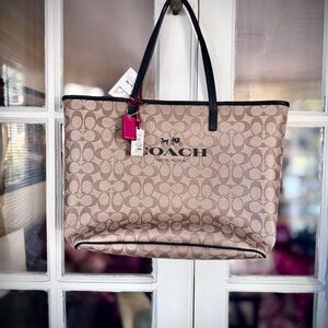 Coach New York Tote Tan Brown black & red with dust bag, 2 Coach tags - red/pink leather & a metal tag. New with tags