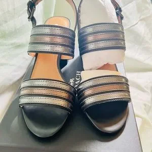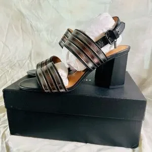 Black 3 1/2in block heel. Silver and bronze metallic strap, with adjustment on back.