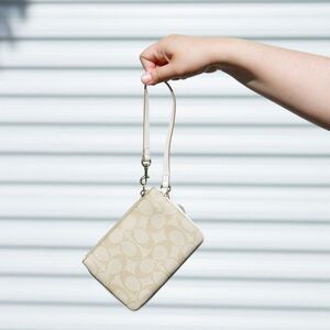 Crafted in Signature fabric, this wristlet is perfectly sized for cards, cash and a phone. Wear it on your wrist or clip it inside a larger Coach bag.