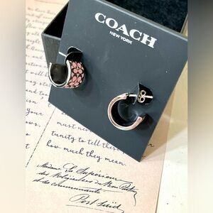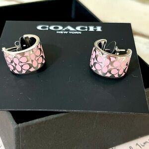 NWT Coach silver tone pink signature small hoop earrings. Barbie vibes. Barbie core!! Plated brass and enamel with possibly sterling silver post (according to information I found on same style just not pink on Coach website) Sooo pretty and classy!! Comes with box. 🤩
